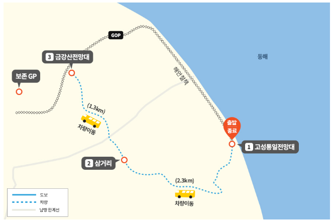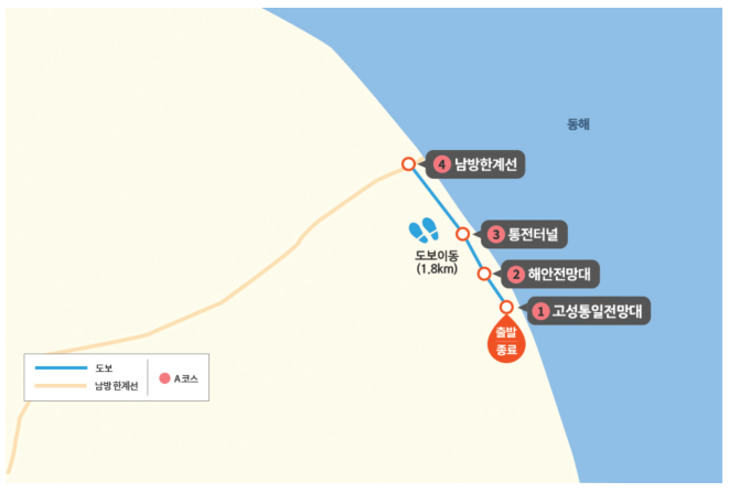 - A코스(3.6km, 도보): 통일전망대 → 해안 철책선 → 해안전망대 → 통전터널 → 남방한계선